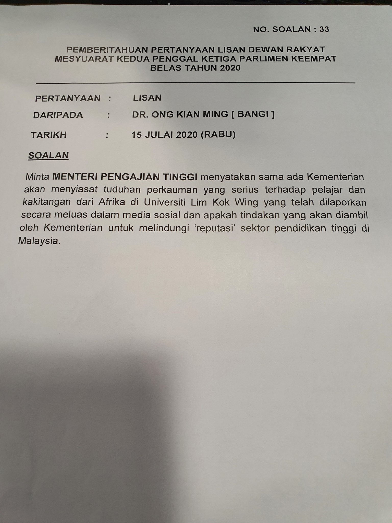 Ong Kian Ming On Twitter My Question On The Accusations Raised Against Limkokwing My Mohe S Reply Show Cause Letter Issued By Mohe Luct Apologized Investigation Still Ongoing Cc Malazdotcom Https T Co Eba4ayaknk