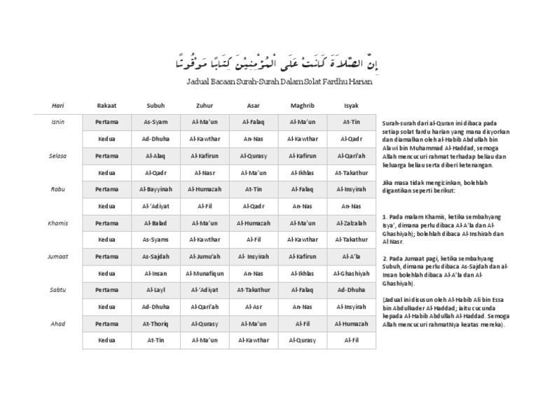 Jadual Bacaan Surah Surah Dalam Solat Fardhu Harian In 2020 Solat Quran Quotes Words