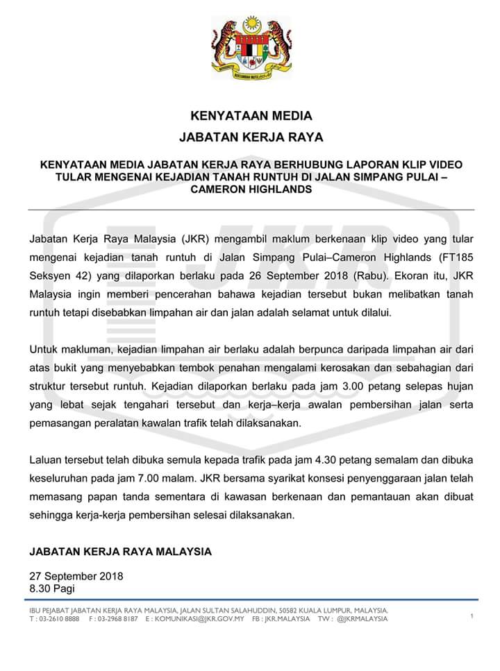 Laluan Simpang Pulai Cameron Highlands Selamat Kepada Pengguna Foto Tular Tidak Benar Libur