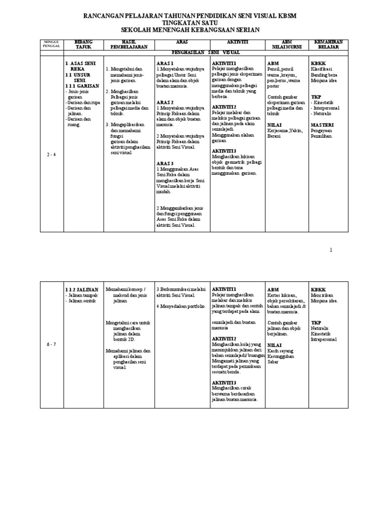 Rancangan Pelajaran Tahunan Pendidikan Seni Visual Tingkatan 1