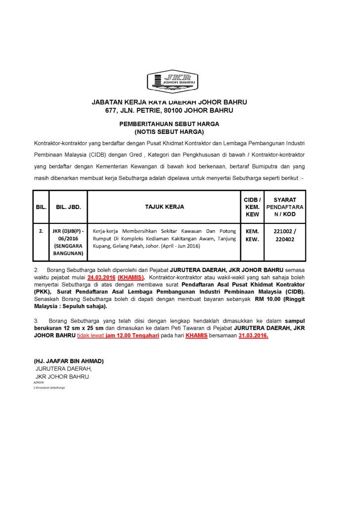 Notis Sebut Harga Kerja Jkr D Johor Bahru Pkk Negeri Johor Facebook
