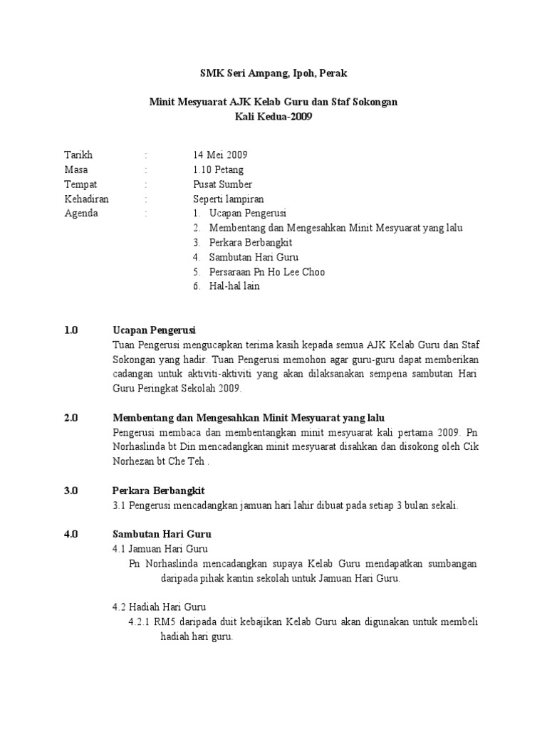 Kali Kedua Contoh Minit Mesyuarat Sekolah