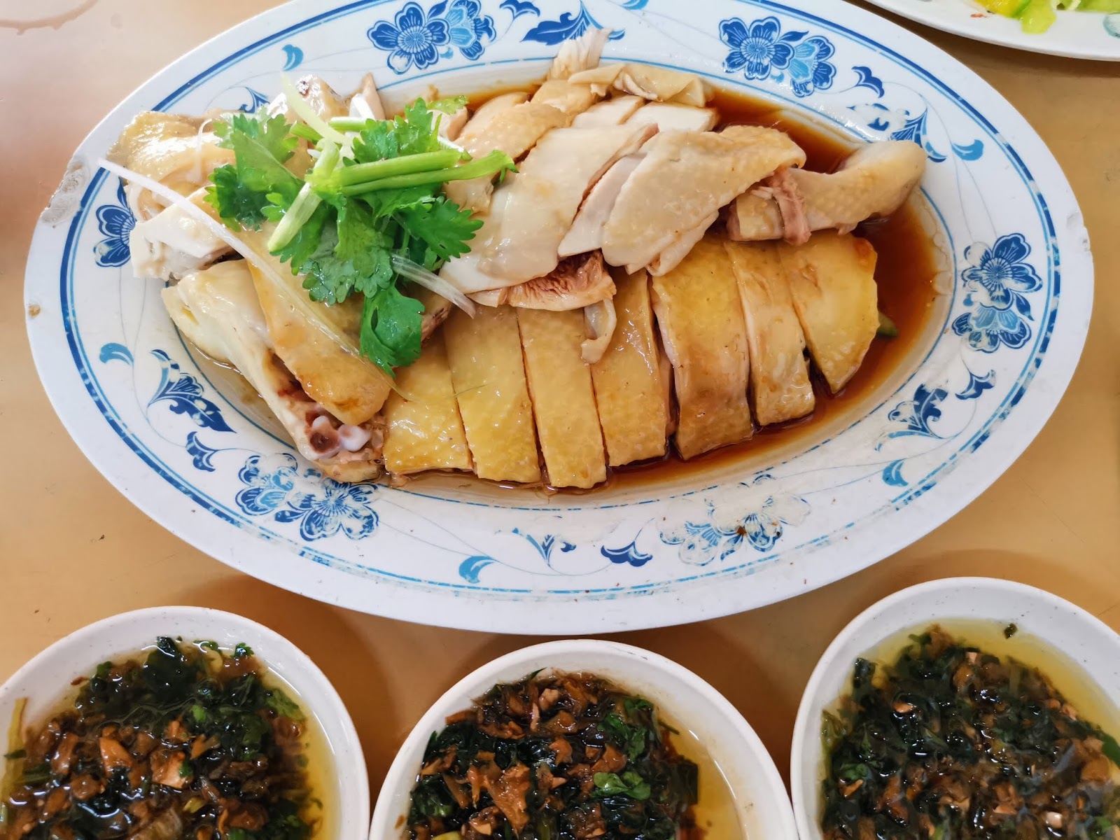 A plate of steam chicken for 2 2 plates of rice taugeh fishball soup 20 ringgit.