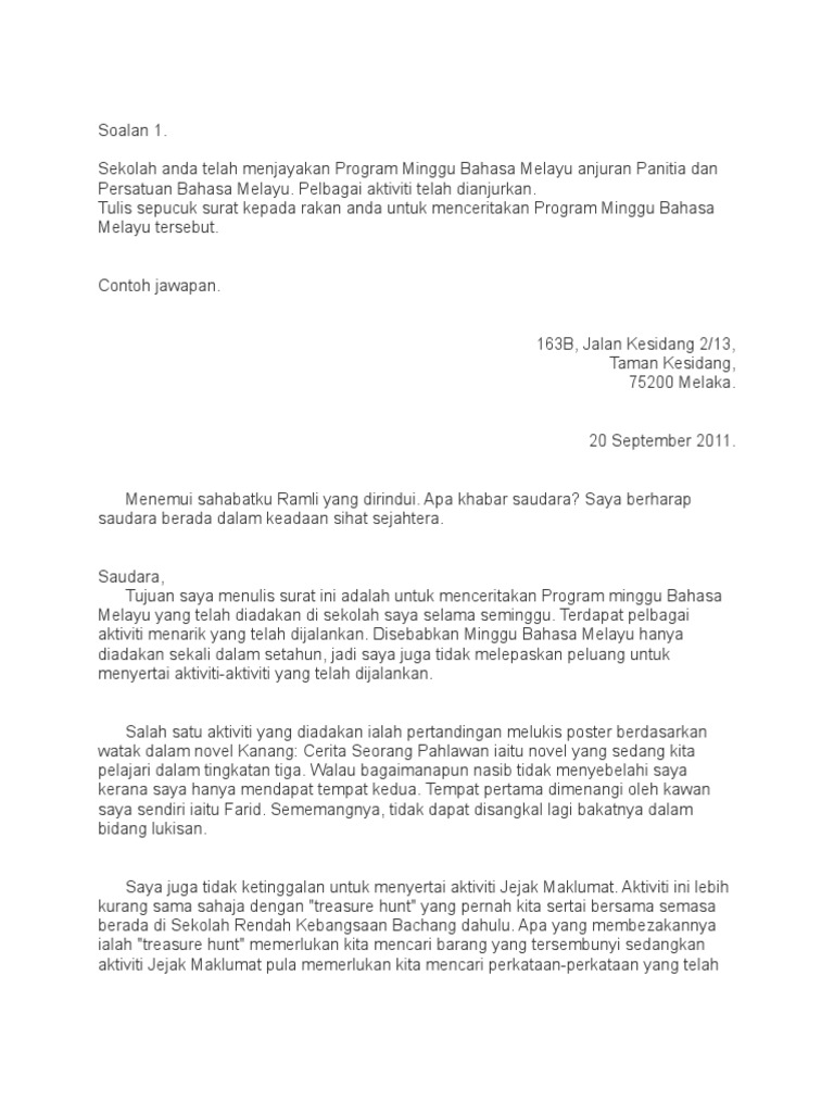 Contoh Soalan Karangan Surat Tidak Rasmi