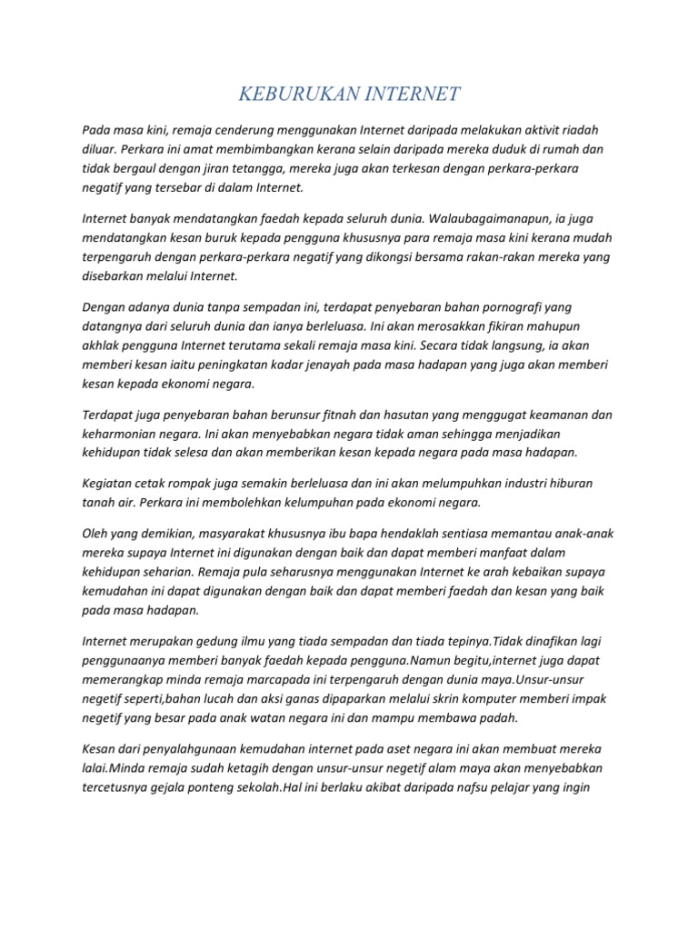 Keburukan internet kepada pelajar sekolah. Pada masa kini penggunaan internet amat penting kepada para pelajar bagi membuat kajian atau menyiapkan tugasan yang diberikan oleh pensyarah atau guru masing masing. Ipendidikan karangan kesan penggunaan telefon bimbit kepada pelajar murid sekolah disemak dan dikemaskini pada pukul 8 13 pm 22 ogos 2020 panduan buat pelajar yang sedang mencari contoh contoh karangan bahasa melayu di internet untuk membuat ulangkaji mata pelajaran. Penggunaan dan perkembangan internet yang meluas dalam bidang perniagaan dan komunikasi akan memudahkan pelaksanaannya dalam bidang pendidikan. Dengan menggunakan perkhidmatan internet kita akan mendapat maklumat yang diperlukan dengan cepat dan kosnya pun murah.