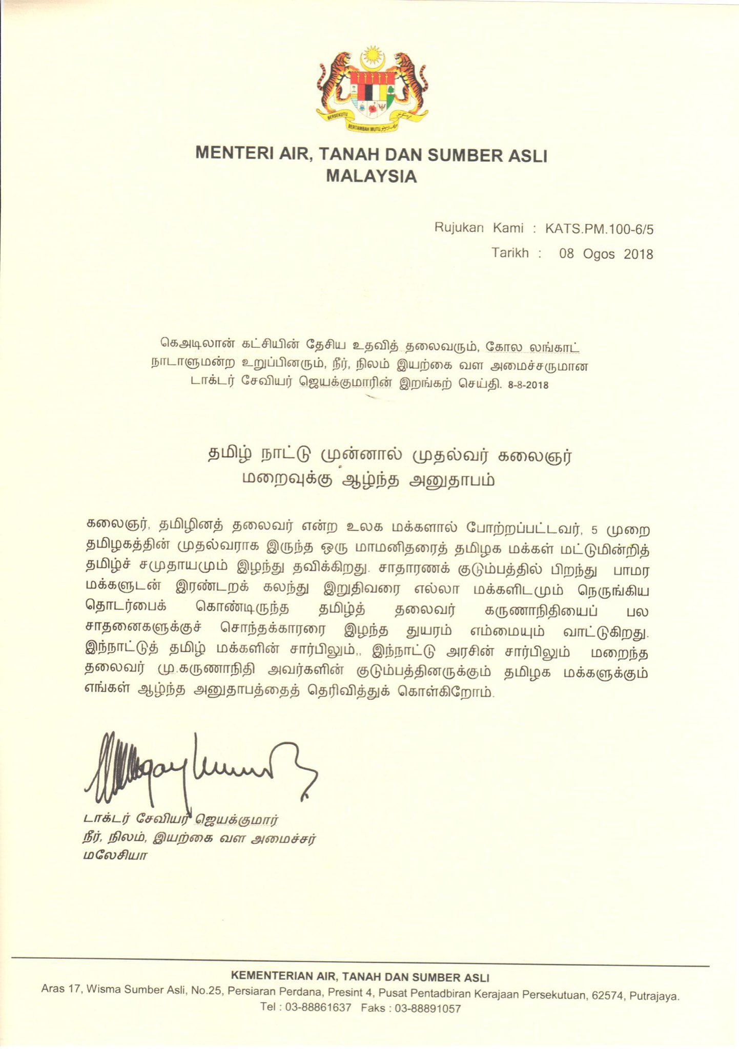 Dr Xavier Jayakumar On Twitter My Condolence Note In Bahasa Malaysia Official And English To Mkstalin And Family For The Loss Of Tamil Nadu Leader And Former Cm Kalaignar Dr M Karunanidhi