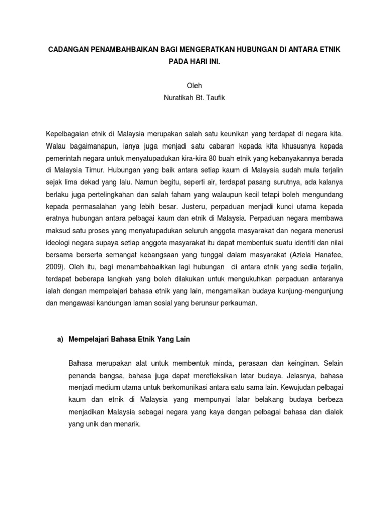 Cadangan Penambahbaikan Bagi Mengeratkan Hubungan Di Antara Etnik Pada Hari Ini