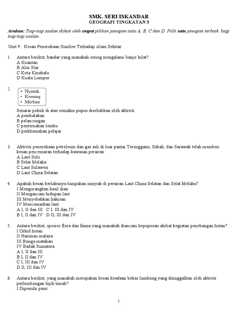 Latihan Ting 3 Unit 9 Kesan Penerokaan Sumber Terhadap Alam Sekitar